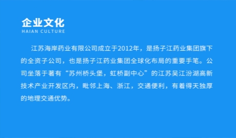 揚(yáng)子江藥業(yè)集團(tuán)江蘇海岸藥業(yè)有限公司成立于2012年10月,是揚(yáng)子江藥業(yè)集團(tuán)全球化布局的重要手筆。公司注冊(cè)資本1.5億元,總投資15億元,占地376畝,規(guī)劃建設(shè)總面積17萬(wàn)平方米,是一家大型綜合性制藥企業(yè),公司現(xiàn)有六大職能部門(mén),五大業(yè)務(wù)部門(mén),在冊(cè)員工250余人,其中專(zhuān)業(yè)技術(shù)人員達(dá)90%以上。公司坐落于著有“蘇州橋頭堡,虹橋副中心”的江蘇吳江汾湖高新技術(shù)產(chǎn)業(yè)開(kāi)發(fā)區(qū)內(nèi),毗鄰上海、浙江,交通便利,有著得天獨(dú)厚的地理交通優(yōu)勢(shì)。