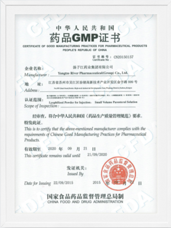 ![]() 小容量注射劑1號車間 于2015年09月22日取得GMP證書 |